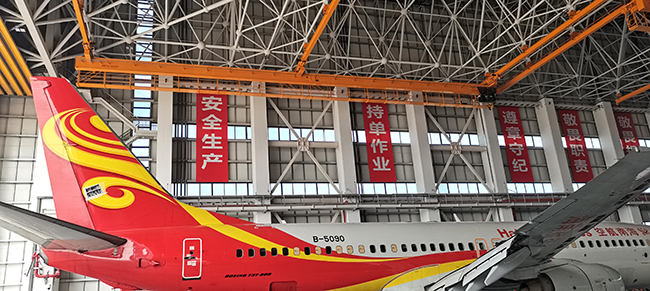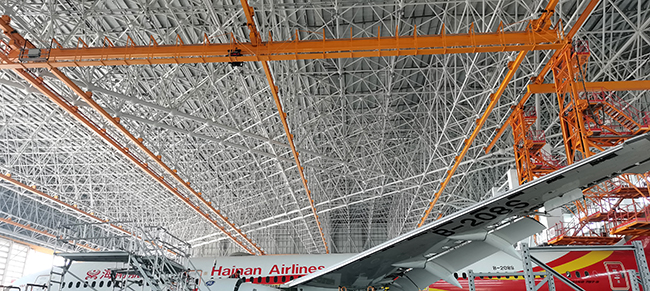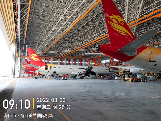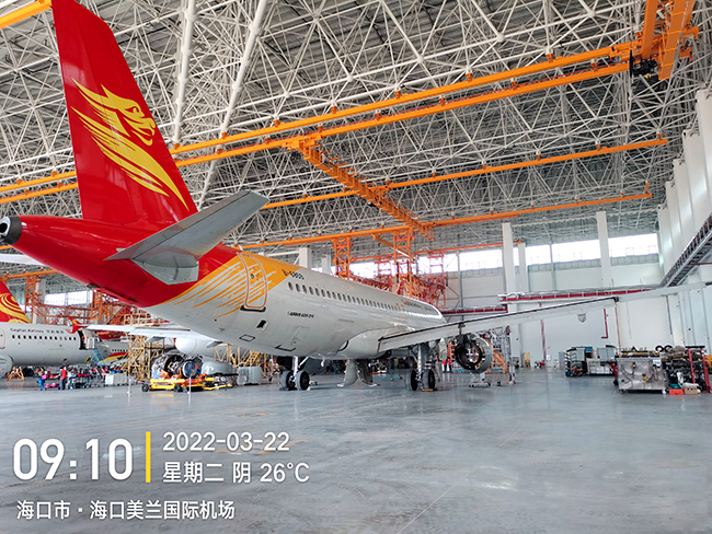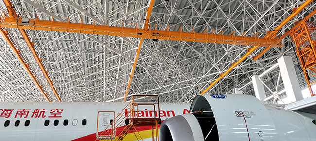 ??诳崭埏w機維修工程有限公司于2020年8月向奧力通采購海口民航飛機維修機庫用多支點超大跨度懸掛起重機8臺,應用于海口美蘭機場新基地機庫的建設,于2022年3月正式交付投入試運營,在中國南大門的自貿港中再添亮麗的一抹金色,奧力通成為海航飛機的最美守護神。