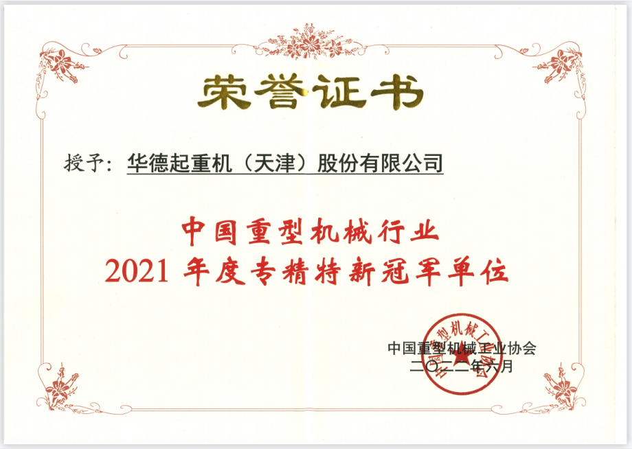 近日,中國重型機(jī)械工業(yè)協(xié)會授予華德起重機(jī)(天津)股份有限公司“中國重型機(jī)械行業(yè)2021年度專精特新冠軍單位”榮譽(yù)稱號。