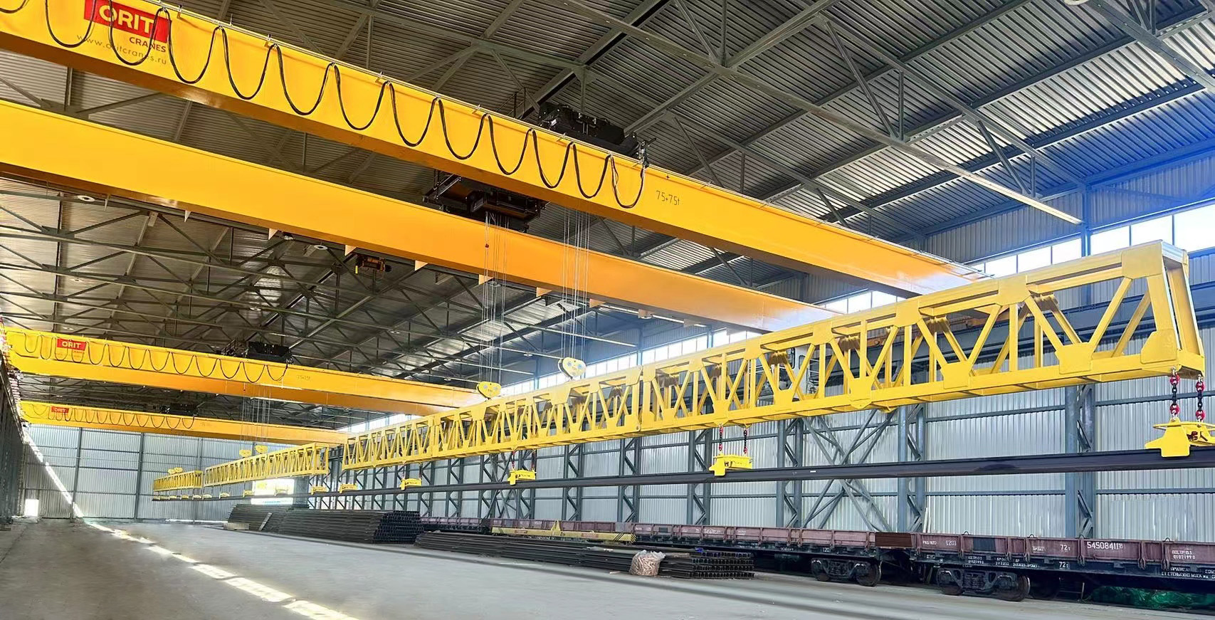 奧力通長軌自動吊,三車聯(lián)動定位精度高,一次性起吊多根幾百米長的超長軌道,實現(xiàn)所有鋼軌同步抓取、同步卸貨,作業(yè)效率高、用工成本低。