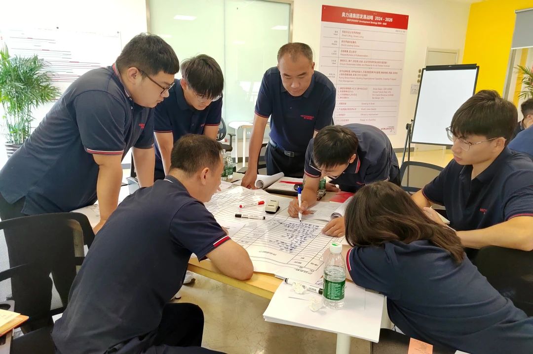 6月盛夏,奧力通起重機生產車間,不同小組的員工們圍聚在各自工段前,相機拍攝著員工作業視頻,手指劃過物流路徑圖,討論聲此起彼伏——這并非日常生產,而是一場“精益思想”向“全員行動”轉化的實戰賦能培訓現場。面對效率提升的迫切需求,奧力通選擇用最接地氣的方式,讓一線骨干成為“精益改善先鋒”。