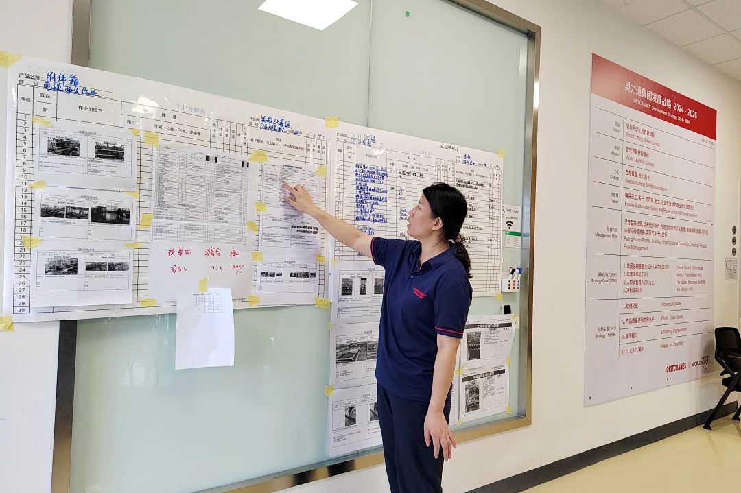 在奧力通起重機總裝車間,一名班組長正用手機拍攝工人裝箱的全過程。視頻中,工人第3次轉身去身后貨架拿取零部件的時候,他按下暫停鍵,在工作分解表上記錄下:“動作浪費:走動距離XX米,耗時XX秒”——這正是奧力通員工運用“ECRS屠龍術”現場獵殺浪費的縮影。