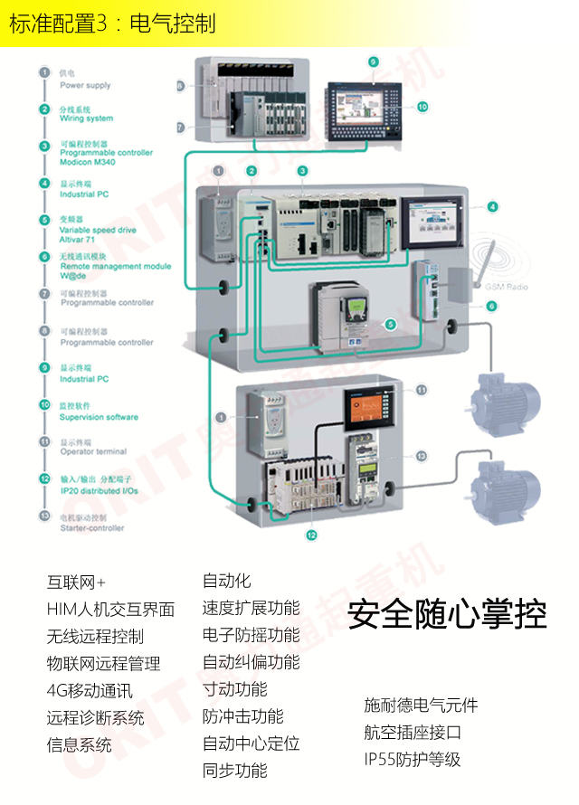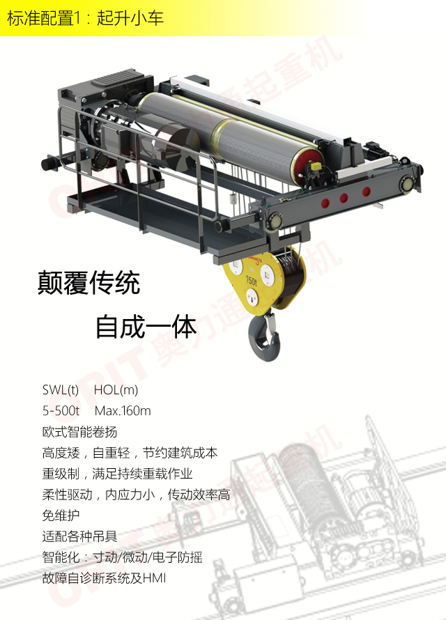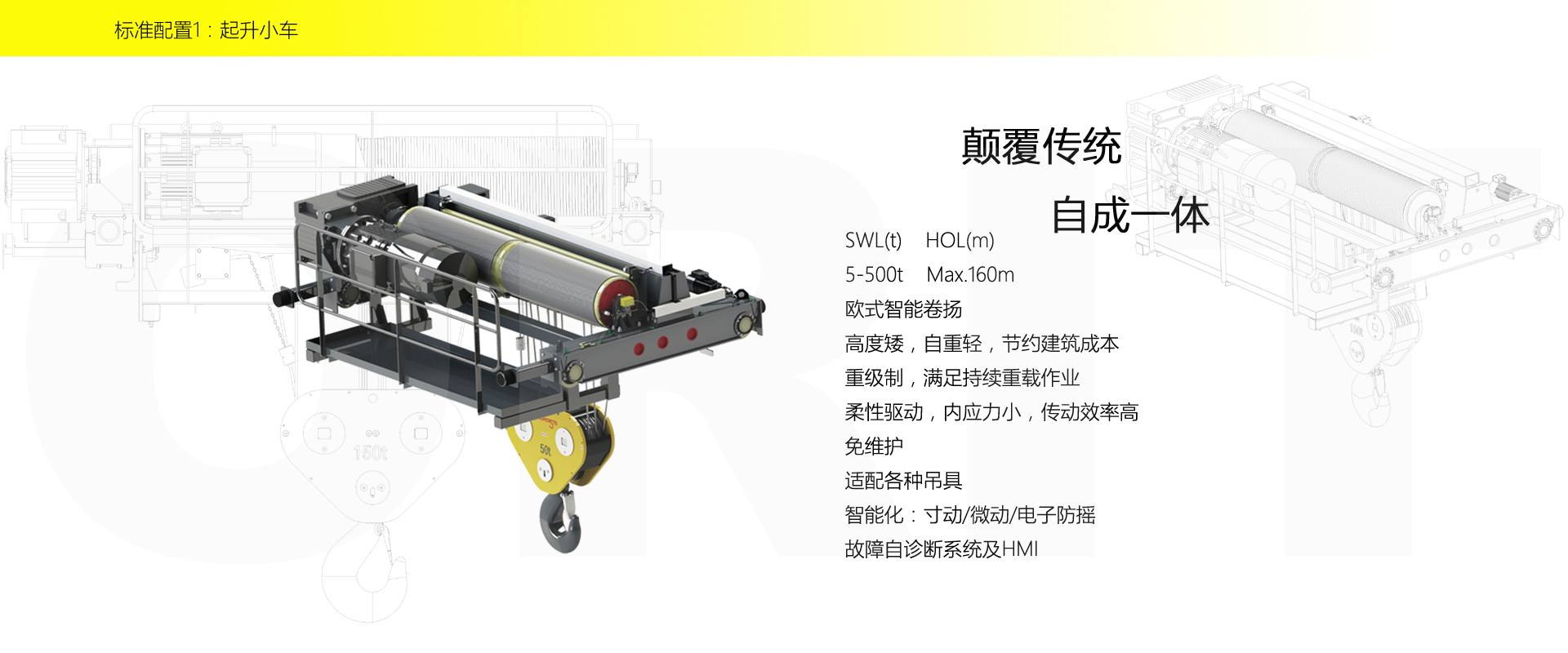 產品名稱:大噸位起重機 優化設計,自重輕,輪壓小,高度矮 硬齒面柔性驅動,緊湊型結構 變頻控制,運行平穩 實時安全監控,確保吊運安全 標準化配置,讓性能無比穩定 適用于500t以下雙梁起重機 標準配置1:起升機構 顛覆傳統,自成一體 SWL(t) HOL(m) 5-500t Max.160m 歐式智能卷揚 高度矮,自重輕,節約建筑成本 重級制,滿足持續重載作業 柔性驅動,內應力小,傳動效率高 免維護 適配各種吊具 智能化:寸動/微動/電子防搖 故障自診斷系統及HMI 標準配置2:三合一驅動 靜音科技,靜享搬運 結構緊湊,鋁合金殼體,密封 變頻電機+硬齒面減速箱+盤式制動器 龍門專用C型三合一集成化設計,節約空間 全變頻調速 最高轉速4800 r/min 防護等級IP55 半油脂潤滑,免維護 靜音科技,靜享搬運 標準配置3:電控系統 安全隨心掌控 智能安全監控器 計算起升機構剩余安全工作時間 累計起升工作時間 累計超載次數 累計起升電機啟動次數 起升電機過熱保護及報警 剎車片厚度報警 ... ... 遠程通訊 施耐德電氣元件 航空插座接口 IP55防護等級 互聯網+ HIM人機交互界面 無線遠程控制 物聯網遠程管理 4G移動通訊 遠程診斷系統 信息系統 自動化 速度擴展功能 電子防搖功能 自動糾偏功能 寸動功能 防沖擊功能 自動中心定位 同步功能 標準配置4:端梁 多變靈活,適應自如 模塊化直驅設計 自重輕、體積小 多種連接方式,安裝尺寸靈活 適用各種廠房,降低廠房高度 QT700車輪,自潤滑,更靜音 采用調心軸承,適應更自如 應用