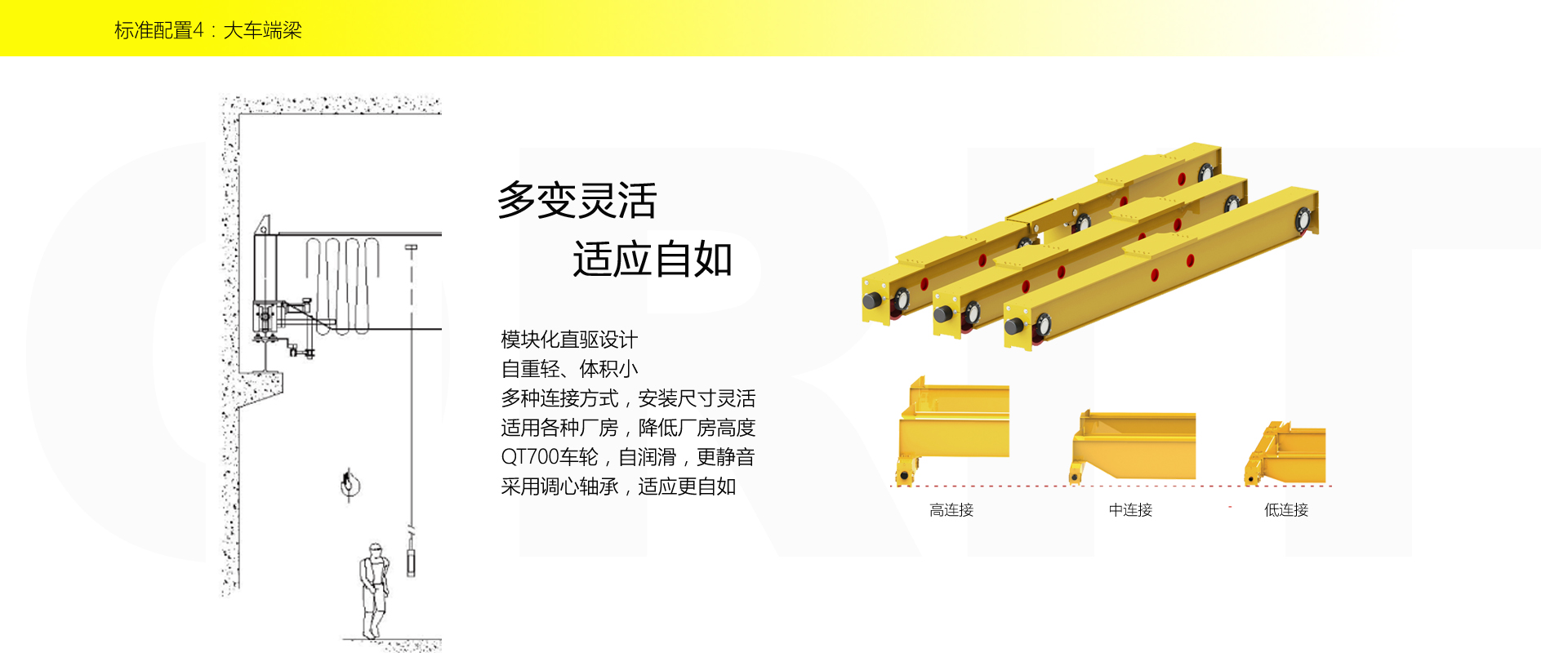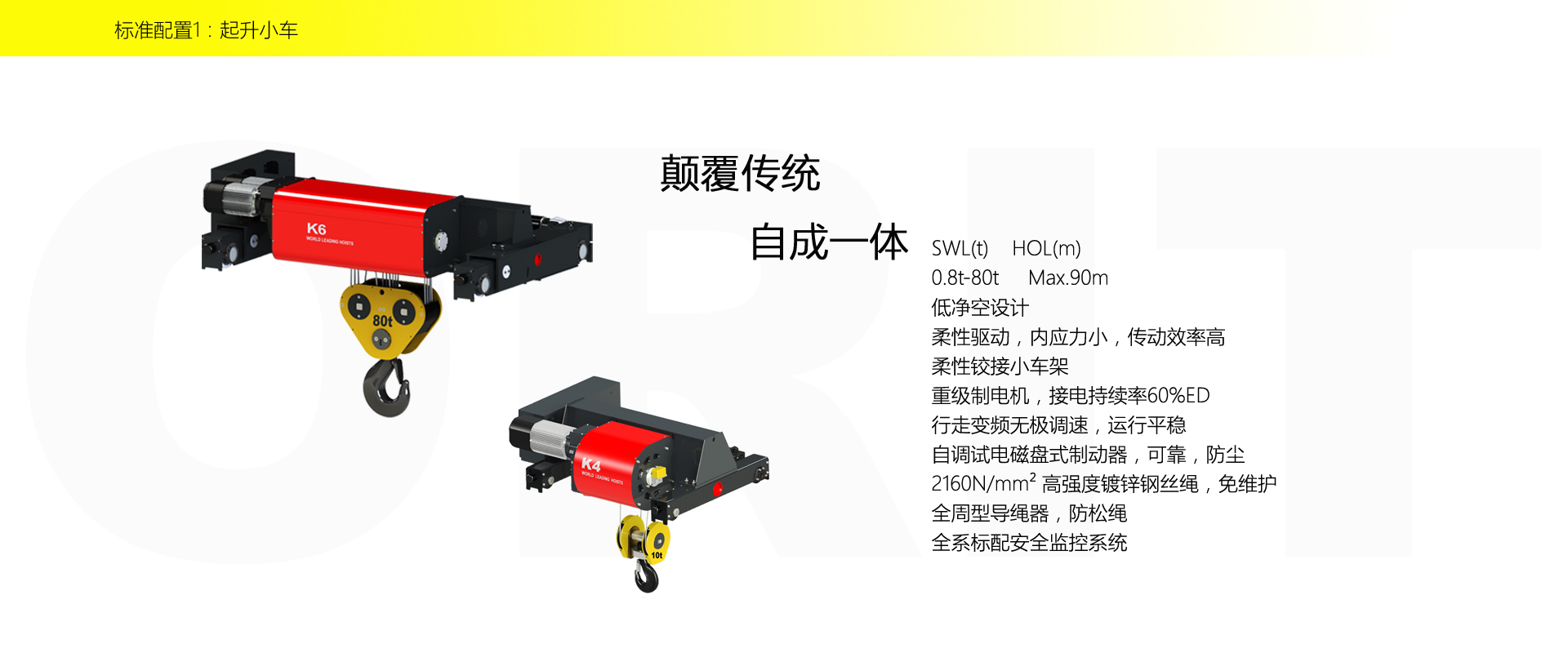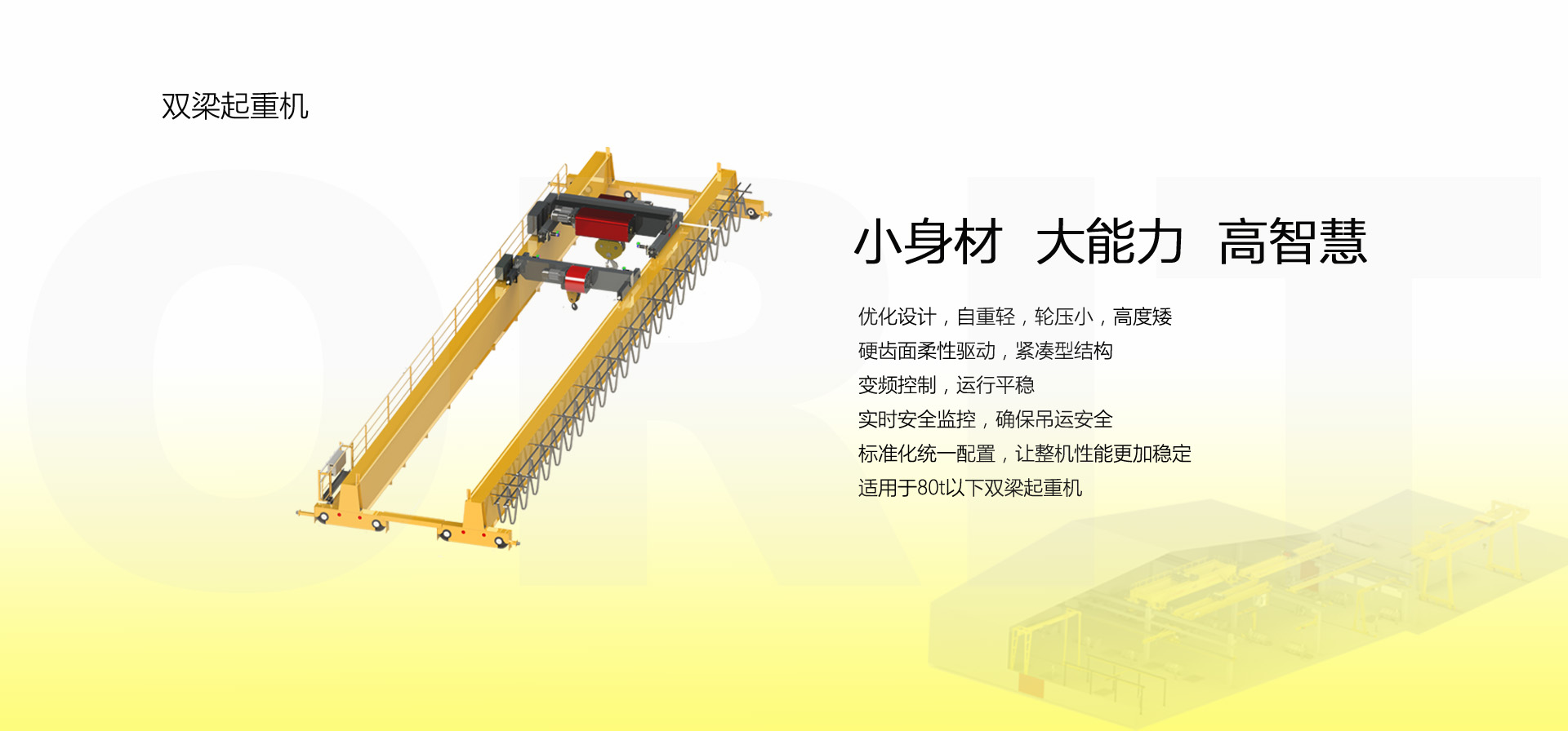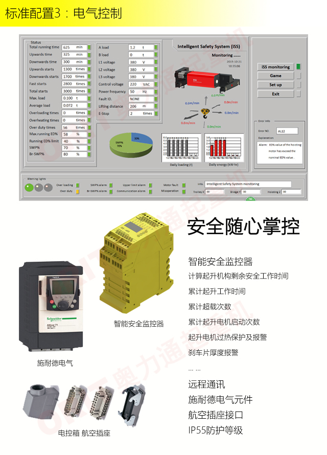 產品名稱:雙梁橋式起重機 小身材、大能力、高智慧 優化設計,自重輕,輪壓小,高度矮 硬齒面柔性驅動,緊湊型結構 變頻控制,運行平穩 實時安全監控,確保吊運安全 標準化配置,讓性能無比穩定 適用于80t以下雙梁起重機 標準配置1:起升機構 顛覆傳統,自成一體 SWL(t) HOL(m) 0.8t-80t Max.90m 低凈空設計 柔性驅動,內應力小,傳動效率高 柔性鉸接小車架 重級制電機,接電持續率60%ED 行走變頻無極調速,運行平穩 自調試電磁盤式制動器,可靠,防塵 2160N/mm2 高強度鍍鋅鋼絲繩,免維護 全周型導繩器,防松繩 全系標配安全監控系統 標準配置2:三合一驅動 靜音科技,靜享搬運 結構緊湊,鋁合金殼體,密封 變頻電機+硬齒面減速箱+盤式制動器 三合一集成化設計 全變頻調速 最高轉速4800 r/min 防護等級IP55 半油脂潤滑,免維護 靜音科技,靜享搬運 標準配置3:電控系統 安全隨心掌控 智能安全監控器 計算起升機構剩余安全工作時間 累計起升工作時間 累計超載次數 累計起升電機啟動次數 起升電機過熱保護及報警 剎車片厚度報警 ... ... 遠程通訊 施耐德電氣元件 航空插座接口 IP55防護等級 標準配置4:端梁 多變靈活,適應自如 模塊化直驅設計 自重輕、體積小 多種連接方式,安裝尺寸靈活 適用各種廠房,降低廠房高度 QT700車輪,自潤滑,更靜音 采用調心軸承,適應更自如 應用