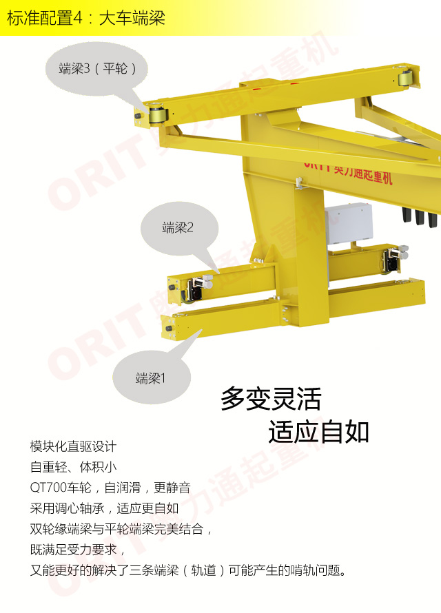 產品名稱:壁行式起重機 多層車間的最佳選擇 優化設計,結構緊湊 變頻控制,運行平穩 實時安全監控,確保吊運安全 占用空間小,工作面積大 集高強度低架構與一體,達到最大的提升設計 適用于5t以下額定載荷平穩、快速地起吊搬運。 標準配置1:起升機構 顛覆傳統,自成一體 低凈空設計 柔性驅動,內應力小,傳動效率高 重級制電機,接電持續率60%ED 行走變頻無極調速,運行平穩 自調試電磁盤式制動器,可靠,防塵 2160N/mm2 高強度鍍鋅鋼絲繩,免維護 全周型導繩器,防松繩 全系標配安全監控系統 標準配置2:三合一驅動 靜音科技,靜享搬運 結構緊湊,鋁合金殼體,密封 變頻電機+硬齒面減速箱+盤式制動器 龍門專用C型三合一集成化設計,節約空間 全變頻調速 最高轉速4800 r/min 防護等級IP55 半油脂潤滑,免維護 靜音科技,靜享搬運 標準配置3:電控系統 安全隨心掌控 智能安全監控器 計算起升機構剩余安全工作時間 累計起升工作時間 累計超載次數 累計起升電機啟動次數 起升電機過熱保護及報警 剎車片厚度報警 ... ... 遠程通訊 施耐德電氣元件 航空插座接口 IP55防護等級 標準配置4:端梁 多變靈活,適應自如 模塊化直驅設計 自重輕、體積小 QT700車輪,自潤滑,更靜音 采用調心軸承,適應更自如 雙輪緣端梁與平輪端梁完美結合, 既滿足受力要求, 又徹底的解決了三條端梁(軌道)可能產生的啃軌問題。 應用