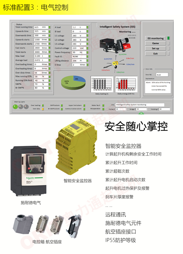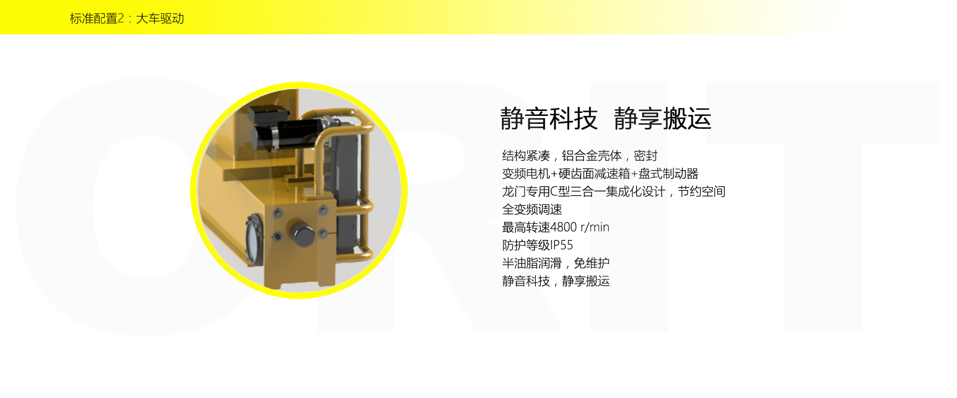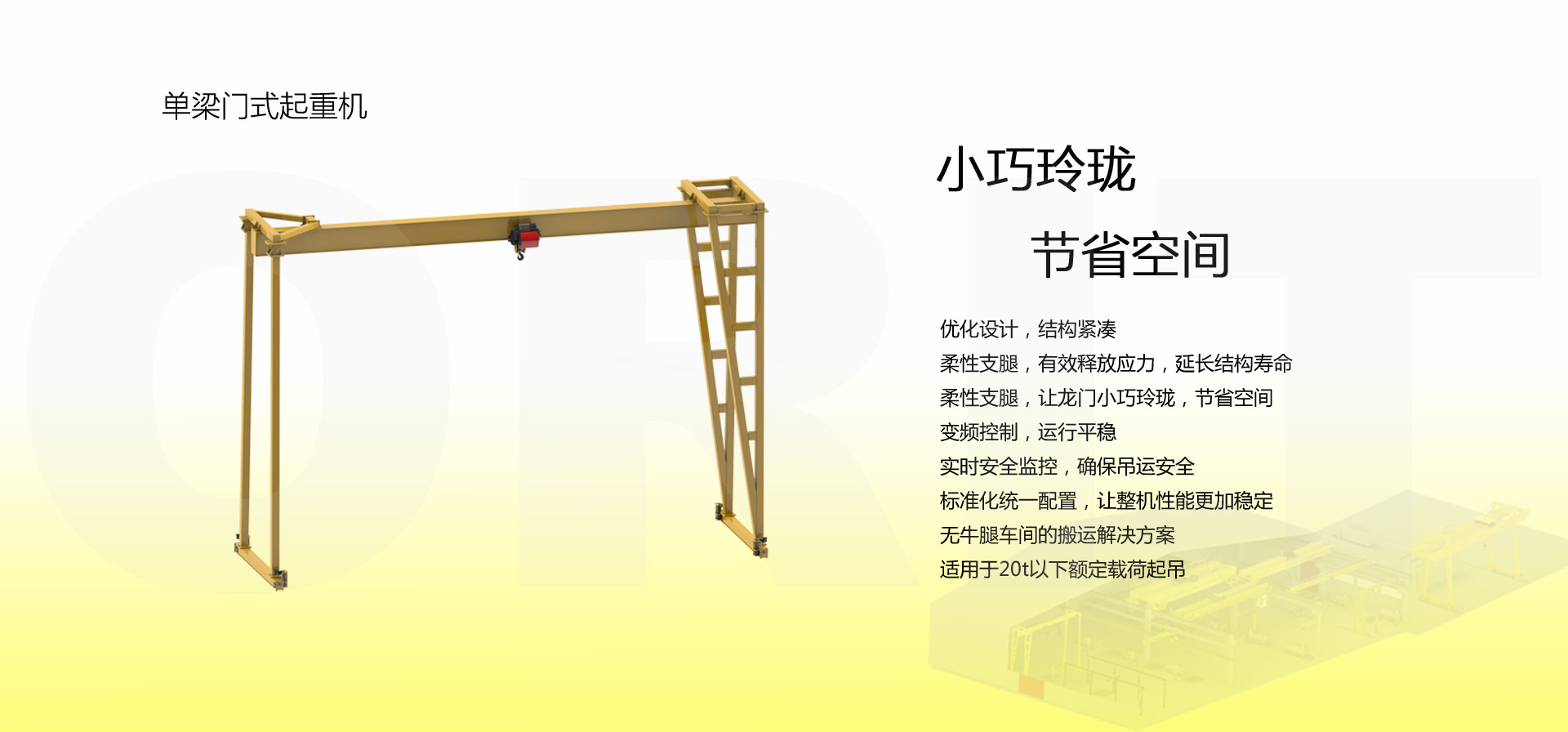 產(chǎn)品名稱(chēng):?jiǎn)瘟洪T(mén)式起重機(jī) 小巧玲瓏,節(jié)省空間 優(yōu)化設(shè)計(jì),結(jié)構(gòu)緊湊 柔性支腿,有效釋放應(yīng)力,延長(zhǎng)結(jié)構(gòu)壽命 柔性支腿,讓龍門(mén)小巧玲瓏,節(jié)省空間 變頻控制,運(yùn)行平穩(wěn) 實(shí)時(shí)安全監(jiān)控,確保吊運(yùn)安全 標(biāo)準(zhǔn)化配置,讓性能無(wú)比穩(wěn)定 無(wú)牛腿車(chē)間搬運(yùn)的最佳解決方案 適用于20t以下額定載荷起吊 標(biāo)準(zhǔn)配置1:起升機(jī)構(gòu) 顛覆傳統(tǒng),自成一體 低凈空設(shè)計(jì) 柔性驅(qū)動(dòng),內(nèi)應(yīng)力小,傳動(dòng)效率高 重級(jí)制電機(jī),接電持續(xù)率60%ED 行走變頻無(wú)極調(diào)速,運(yùn)行平穩(wěn) 自調(diào)試電磁盤(pán)式制動(dòng)器,可靠,防塵 2160N/mm2 高強(qiáng)度鍍鋅鋼絲繩,免維護(hù) 全周型導(dǎo)繩器,防松繩 全系標(biāo)配安全監(jiān)控系統(tǒng) 標(biāo)準(zhǔn)配置2:三合一驅(qū)動(dòng) 靜音科技,靜享搬運(yùn) 結(jié)構(gòu)緊湊,鋁合金殼體,密封 變頻電機(jī)+硬齒面減速箱+盤(pán)式制動(dòng)器 龍門(mén)專(zhuān)用C型三合一集成化設(shè)計(jì),節(jié)約空間 全變頻調(diào)速 最高轉(zhuǎn)速4800 r/min 防護(hù)等級(jí)IP55 半油脂潤(rùn)滑,免維護(hù) 靜音科技,靜享搬運(yùn) 標(biāo)準(zhǔn)配置3:電控系統(tǒng) 安全隨心掌控 智能安全監(jiān)控器 計(jì)算起升機(jī)構(gòu)剩余安全工作時(shí)間 累計(jì)起升工作時(shí)間 累計(jì)超載次數(shù) 累計(jì)起升電機(jī)啟動(dòng)次數(shù) 起升電機(jī)過(guò)熱保護(hù)及報(bào)警 剎車(chē)片厚度報(bào)警 ... ... 遠(yuǎn)程通訊 施耐德電氣元件 航空插座接口 IP55防護(hù)等級(jí) 標(biāo)準(zhǔn)配置4:端梁 多變靈活,適應(yīng)自如 模塊化直驅(qū)設(shè)計(jì) 自重輕、體積小 多種連接方式,安裝尺寸靈活 適用各種廠房,降低廠房高度 QT700車(chē)輪,自潤(rùn)滑,更靜音 采用調(diào)心軸承,適應(yīng)更自如 應(yīng)用